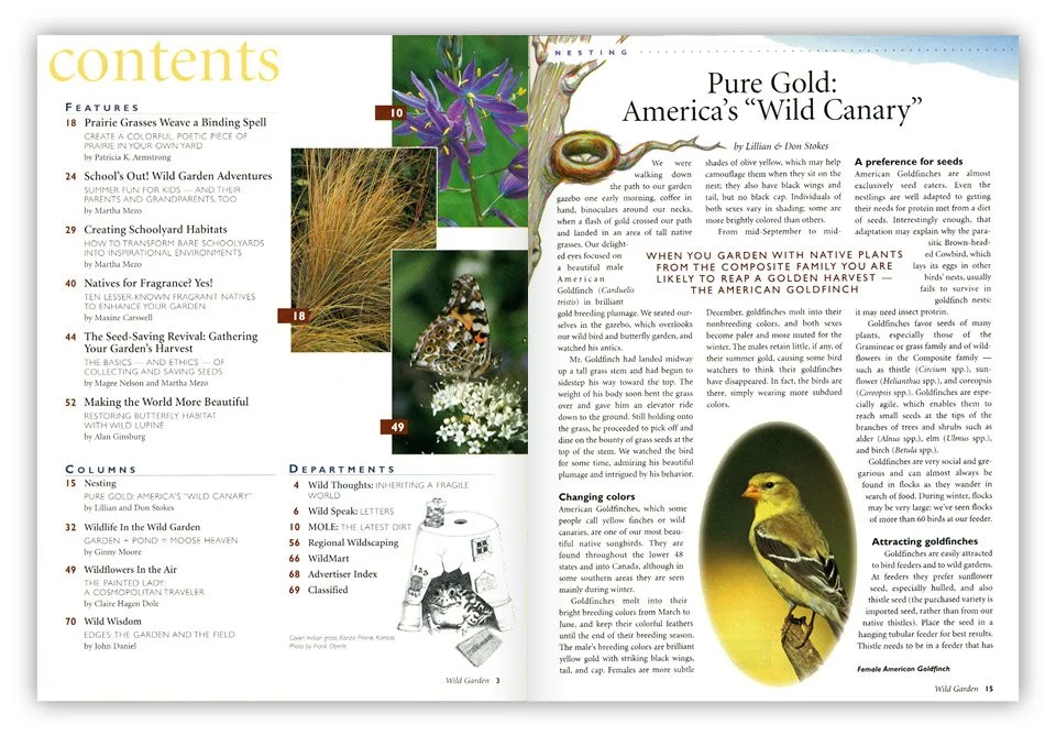 Wild Garden was a start-up magazine in 1997, and Springer Design & Illustration designed everything from the ground up. From the logo, to the brochure and media kit, to the design of the magazine itself, the communication objectives called for a refined, yet down-to-earth look. Aimed at environmentally conscious home-owners, Wild Garden was a resource and inspiration for gardening with native plants, thus minimizing the need for watering, weeding and fertilizing. Native plants also attract native insects and animals, encouraging a balanced mini-ecosystem.